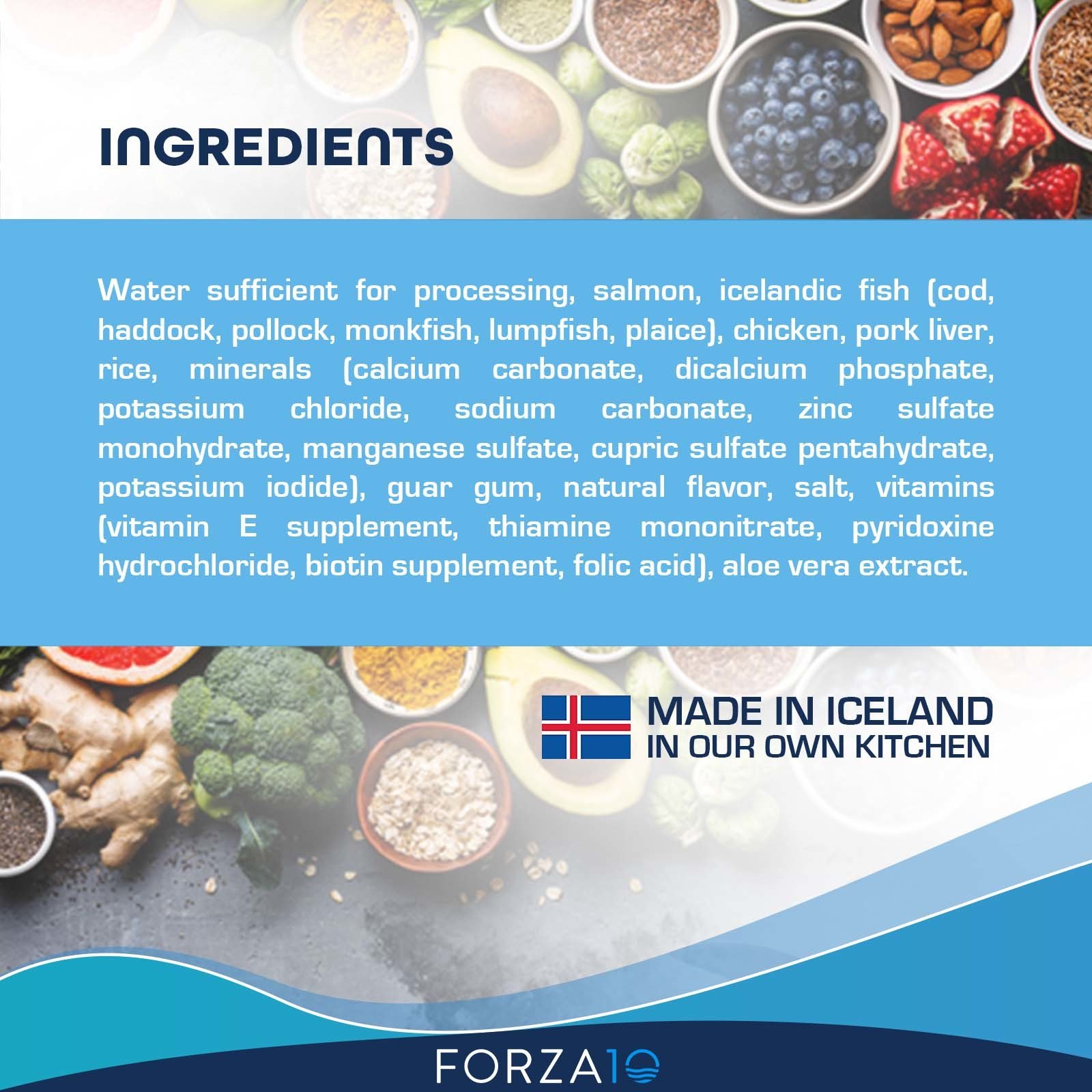 Water sufficient for processing, salmon, chicken liver, lamb, rice, minerals (dicalcium phosphate, calcium carbonate, salt, zinc sulfate, manganese sulfate, potassium iodine), cassia gum, guar gum, locust bean gum, xanthan gum, vitamins (vitamin D3 supplement, vitamin E supplement, thiamine mononitrate, pyridoxine hydrochloride, biotin, folic acid), taurine, vegetable oil, aloe vera extract.