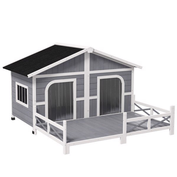 Features:- Cabin styled dog house makes an attractive addition to your yard, patio or other outdoor areas- Roomy main living house and large deck porch- Solid fir wood construction, eco-friendly and non-toxic, safe to your pets- Spacious deck, suitable for lounge and take a nap- Asphalt roof withstands most harsh weather- Raised floor protects against soggy grass, keeps your dogs from insects or moisture- Side window is included for better airflow- Front door with vinyl curtain helps eliminate drafts and keep your pet warm- Perfect for most small to medium sized dogs under 33 lbs- Slide out bottom tray for easy cleaningSpecification:- Material: Fir Wood- Color: Grey and White- Overall Dimension: 59" L x 63.5" W x 39.25" H- Main House Dimension: 53.25" L x 29.5" W x 31.5" H- Inside Door Size: 13.5" W x 21.25" H- Front Door Size: 12.75" W x 18.5" H- Bottom Board Size: 28.25" L x 25" W (left), 28.25" L x 23.5" W (right)- Max Load: 176 lbs (main house), 110 lbs (deck)- Net Weight: 99 lbsPackage Includes:1 x Dog Kennel1 x Manual