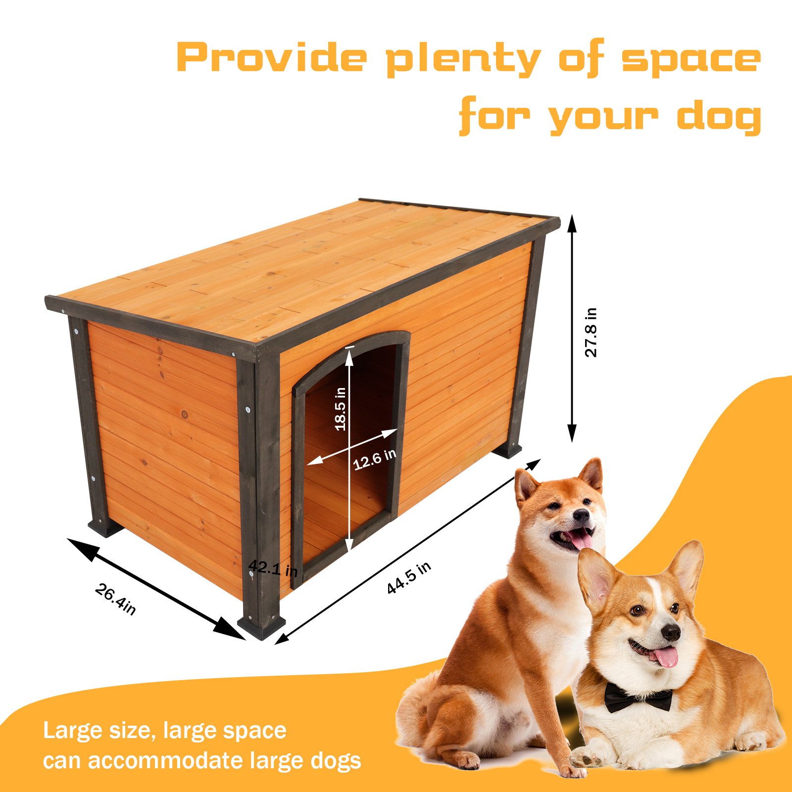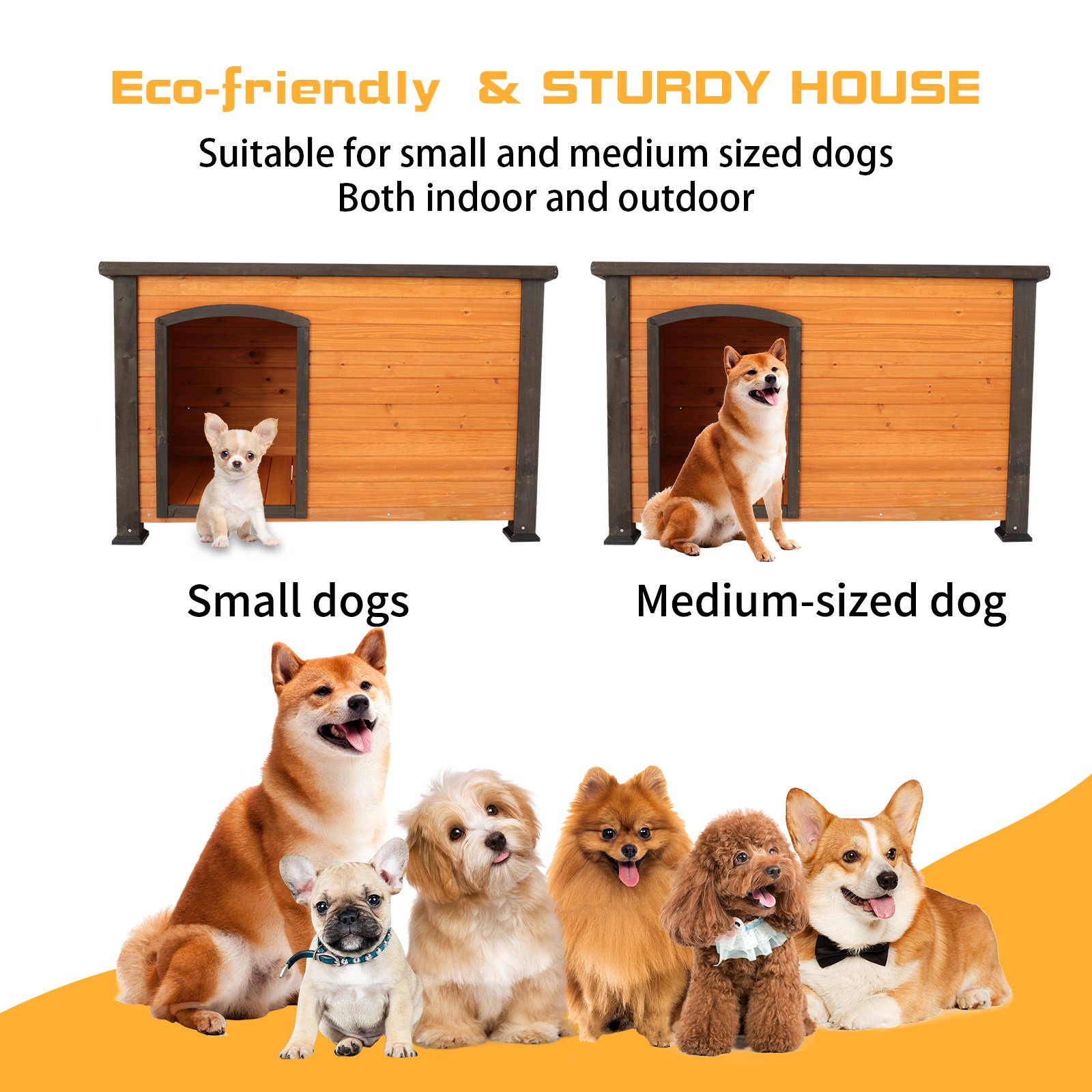 Home > Dog House Outdoor & Indoor Heated Wooden Dog Kennel for Winter with Raised Feet Weatherproof for Large Dogs(Gold red and black)44.5"*26.4"*27.8"(M)