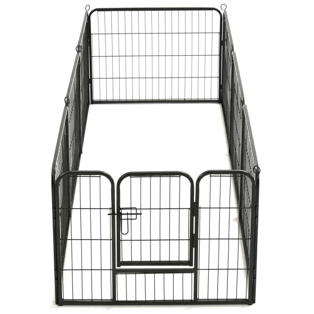 This dog kennel can be easily set up or taken down. It consists of 8 heavy-duty panels and each panel can be easily attached to the next, which allows you to configure the playpen in different shapes. The dog enclosure features a hinged door with a security latch for easy access. This durable and weather-resistant dog playpen is made of rustproof powder-coated steel, making it suitable for outdoor and indoor use. The included ground stakes help secure the playpen outdoors for added stability and security.Color: BlackMaterial: Powder-coated steelEach panel size:31.5" x 23.6"(W x H)Door size:12.2" x 16.9"(W x H)With 8 heavy-duty panelsWith 1 hinged door with a security latchSuitable for indoor and outdoor useEasy to assembleGround stakes included
