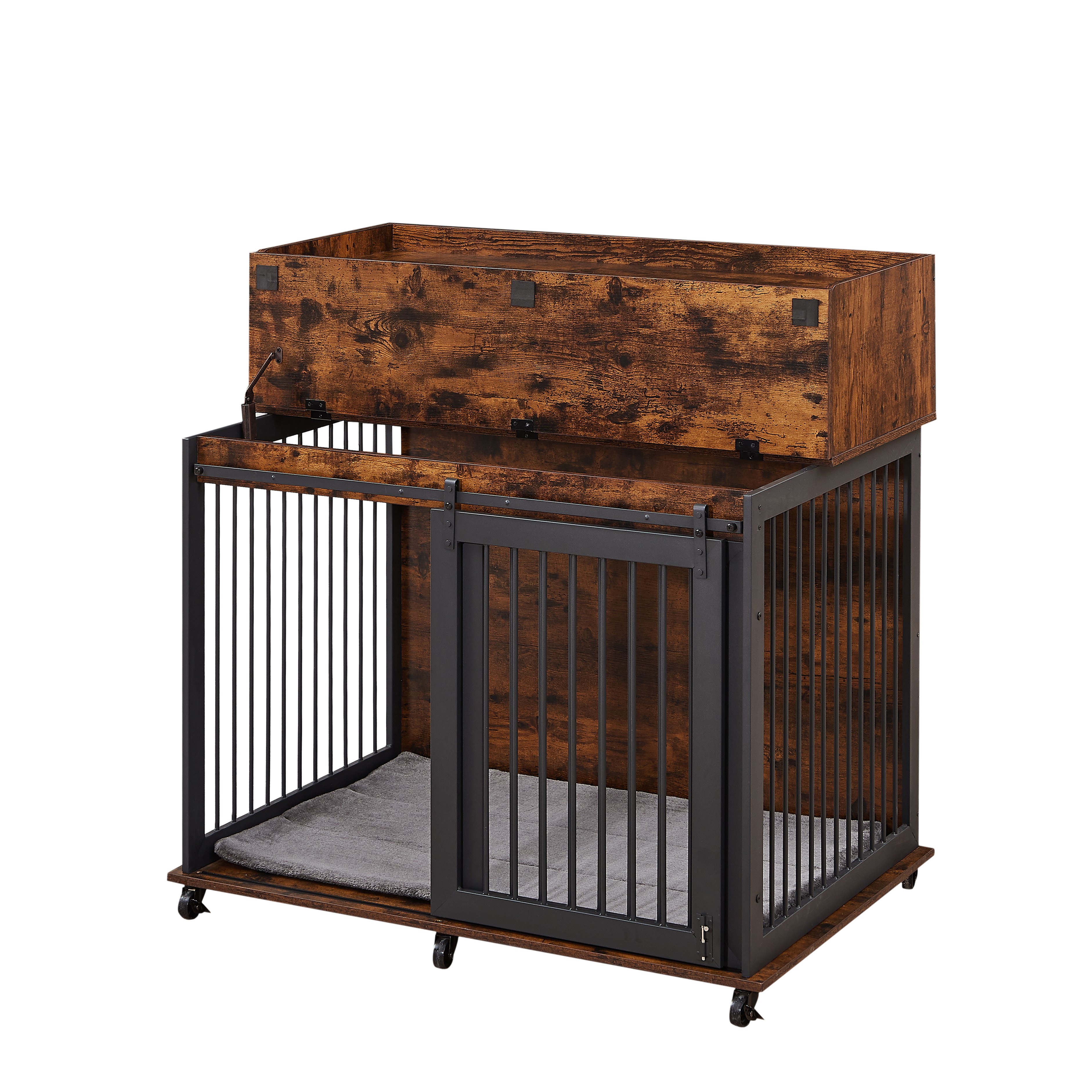 Furniture type dog cage iron frame door with cabinet, top can be opened and closed. Rustic Brown, 43.7'' W x 29.9'' D x 42.2'' H
