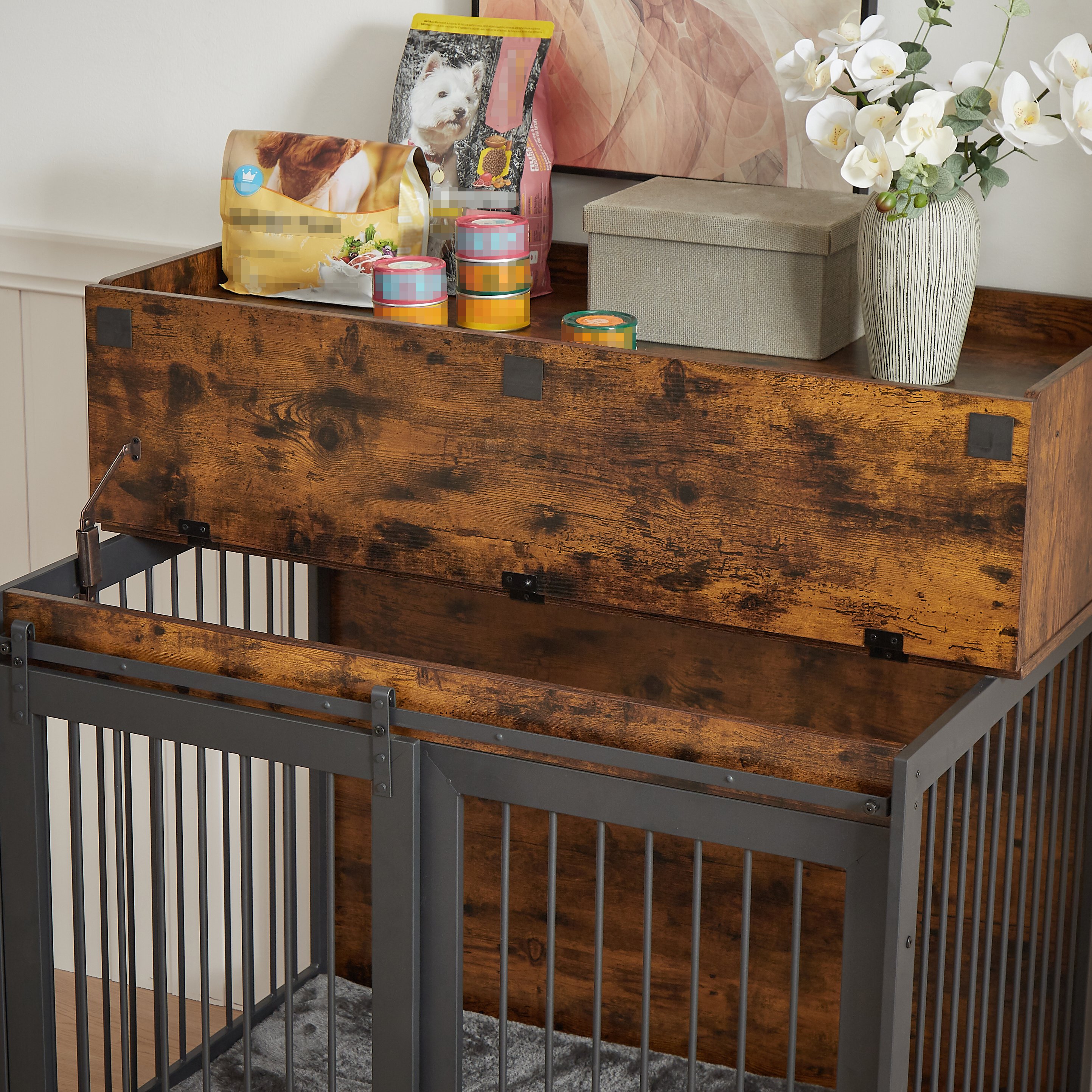 Home > Furniture type dog cage iron frame door with cabinet, top can be opened and closed. Rustic Brown, 43.7'' W x 29.9'' D x 42.2'' H