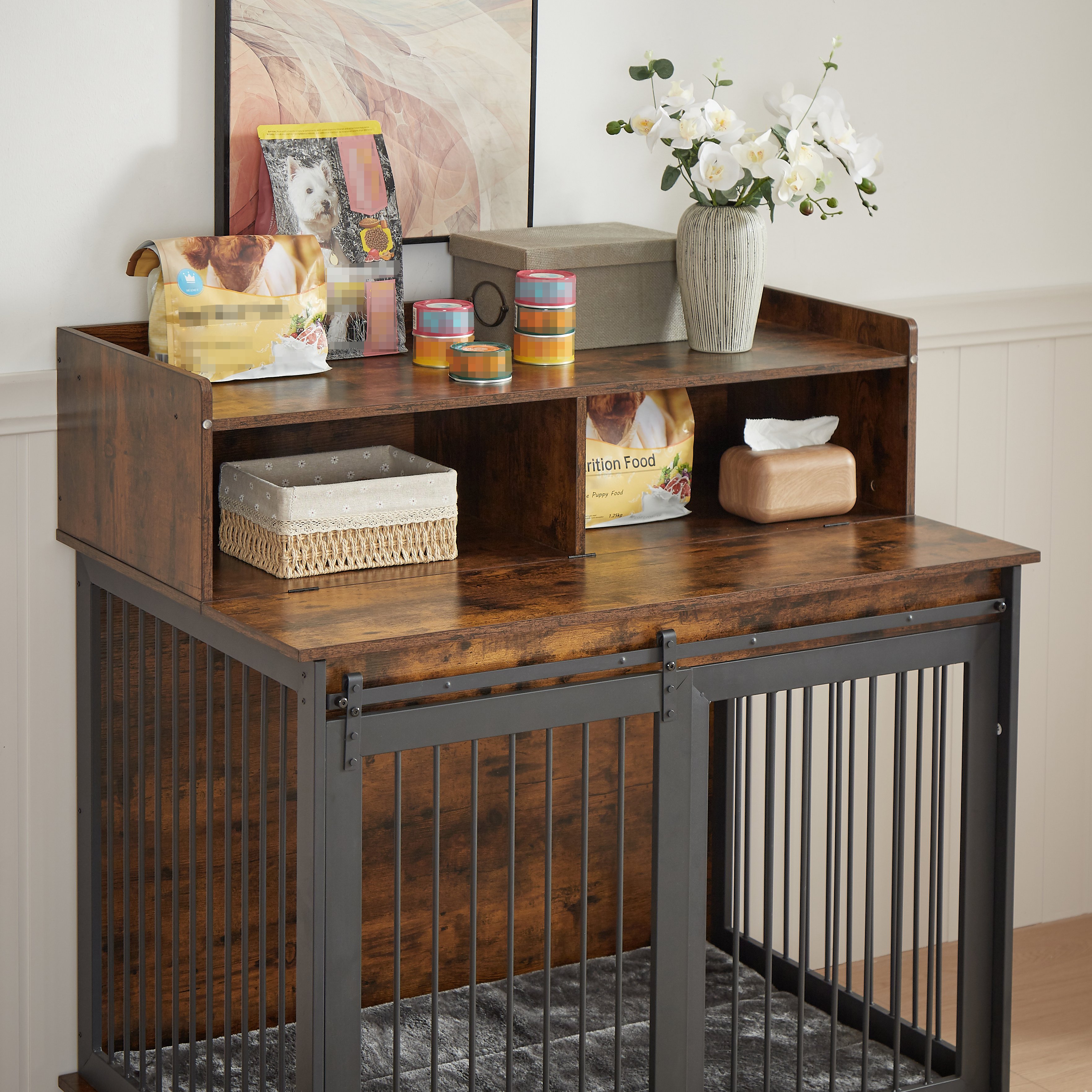 There are two large open drawers above the countertop, which can store dog food, snacks, toys, etc.
