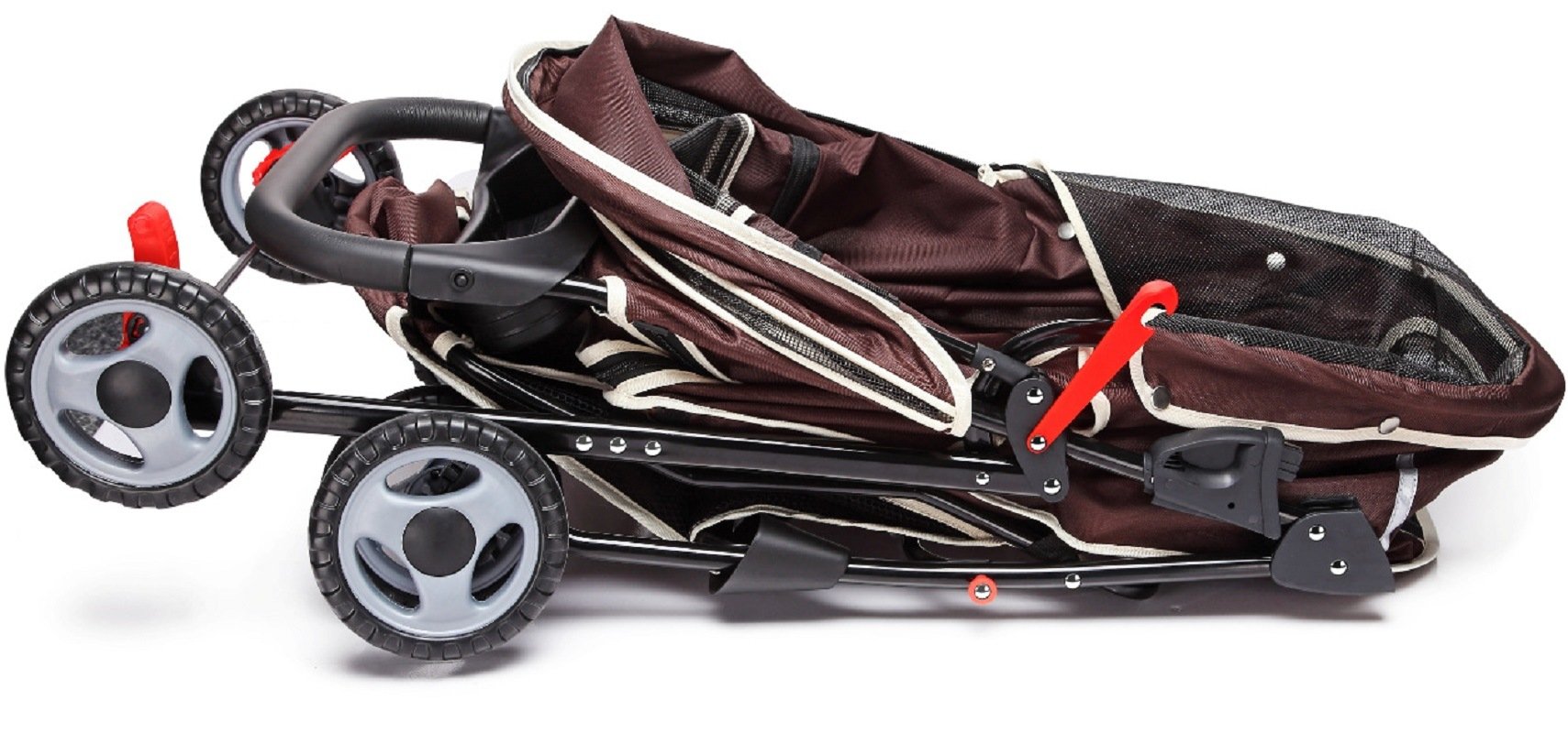 1.Front universal wheels, and rear directional wheels with brake lever included for easy parking, as well as a safety leash inside to keep your pet securely strapped in. 2 pairs of reflective strips on the front and back for attention.