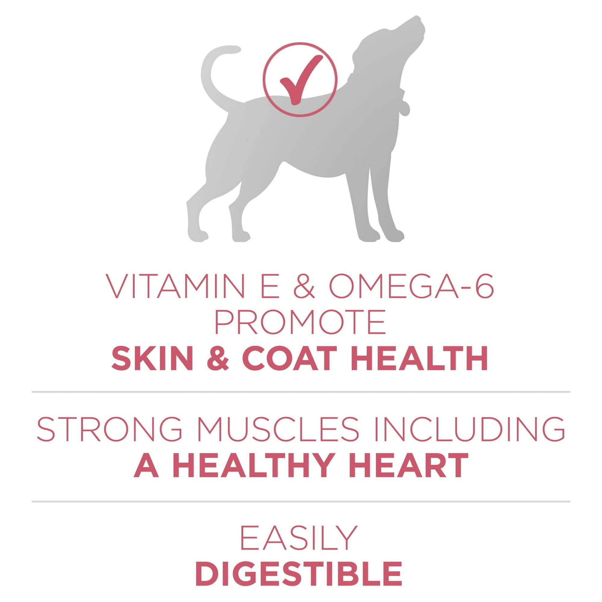 Purina One +Plus Dry Dog Food Skin and Coat Formula, Satisfy your dog with Purina ONE +Plus Natural Skin Coat Formula with added vitamins, minerals and nutrients adult dry dog food. This high protein dog food features real salmon as the #1 ingredient, and when combined with rice, oatmeal and other high-quality ingredients, delivers easy-to-digest nutrition for your dog. Our salmon natural dog food recipe has no artificial colors, flavors or preservatives. The Purina dog food formula also contains vitamin E and omega-6 fatty acids to promote your dog's skin and coat health. With 100% nutrition for adult dogs and 0% fillers, every ingredient has a purpose.
