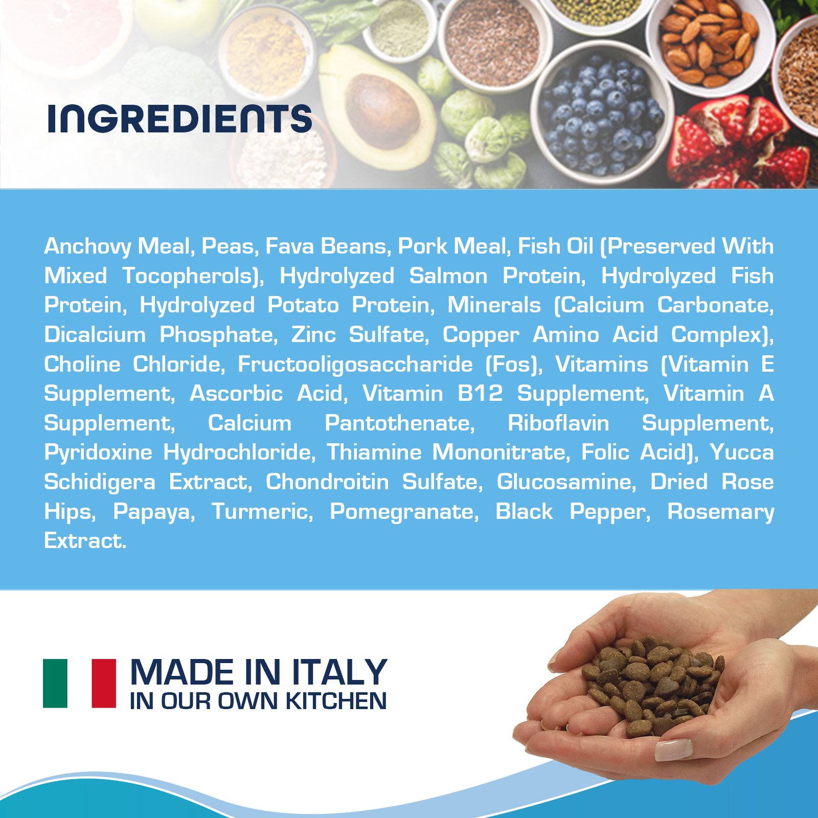 Anchovy Meal, Peas, Fava Beans, Pork Meal, Fish Oil (Preserved With Mixed Tocopherols), Hydrolyzed Salmon Protein, Hydrolyzed Fish Protein, Hydrolyzed Potato Protein, Minerals (Calcium Carbonate, Dicalcium Phosphate, Zinc Sulfate, Copper Amino Acid Complex), Choline Chloride, Fructooligosaccharide (Fos), Vitamins (Vitamin E Supplement, Ascorbic Acid, Vitamin B12 Supplement, Vitamin A Supplement, Calcium Pantothenate, Riboflavin Supplement, Pyridoxine Hydrochloride, Thiamine Mononitrate, Folic Acid), Yucca Schidigera Extract, Chondroitin Sulfate, Glucosamine, Dried Rose Hips, Papaya, Turmeric, Pomegranate, Black Pepper, Rosemary Extract.