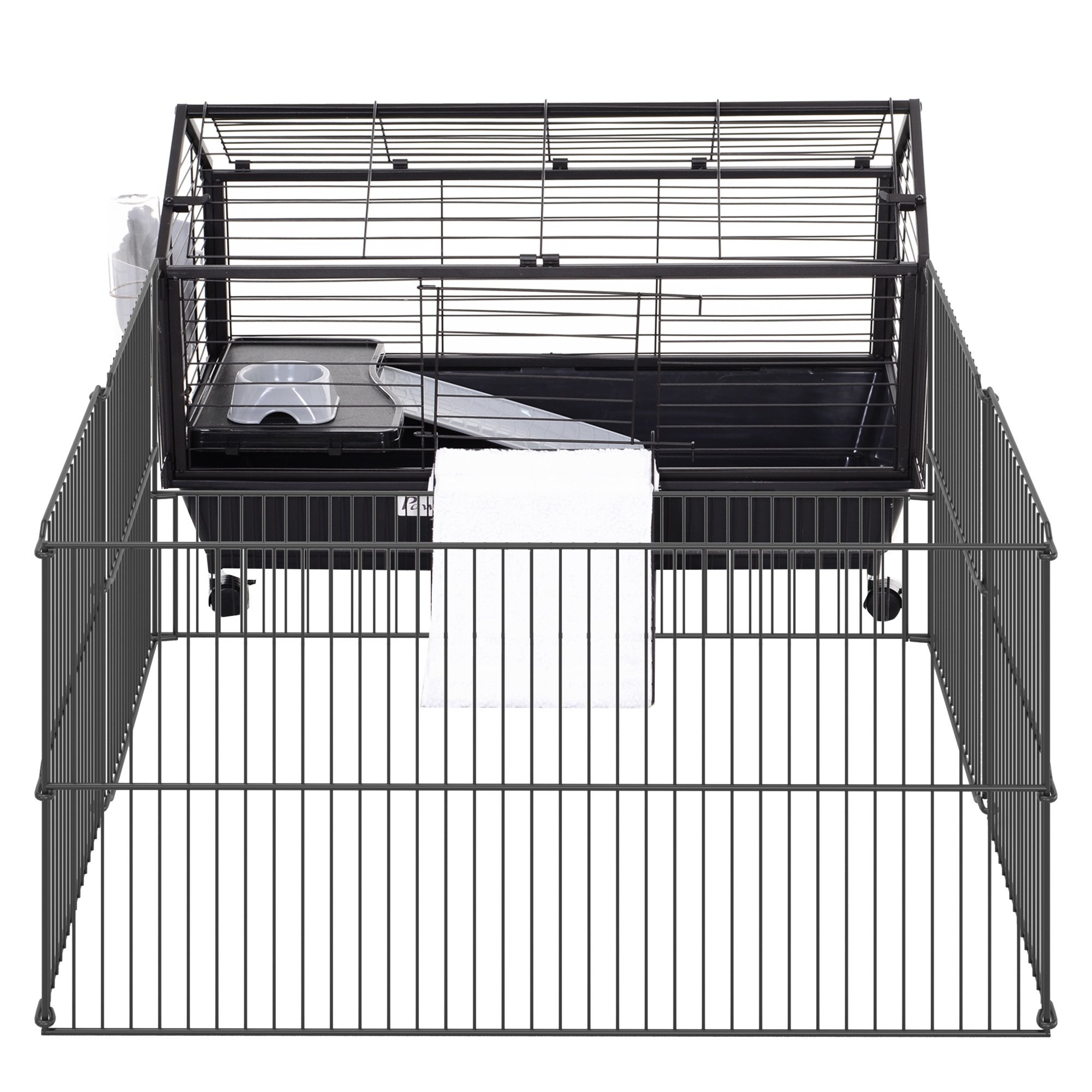 PawHut Small Animal Playpen Cage w/ Rolling Caster, Water Bottle, 35" L● Large playpen folds up into compact size for space-saving storage;● Ideal for bunnies, hedgehogs, guinea pigs, and other small animals; ● Tall playpen walls for securing the space; ● Rolls on wheels for easy moving;● Front door and ramps for easy access. A ramp is wrapped in fleece; ● Tough and durable steel wire; ● Easy assembly required;
